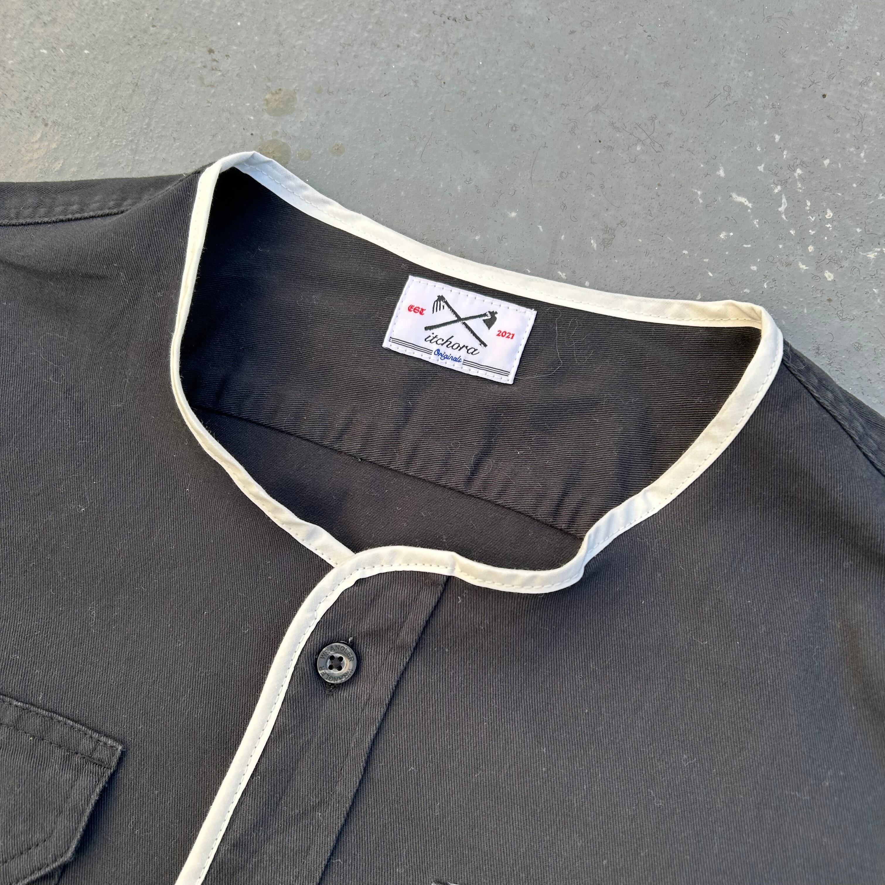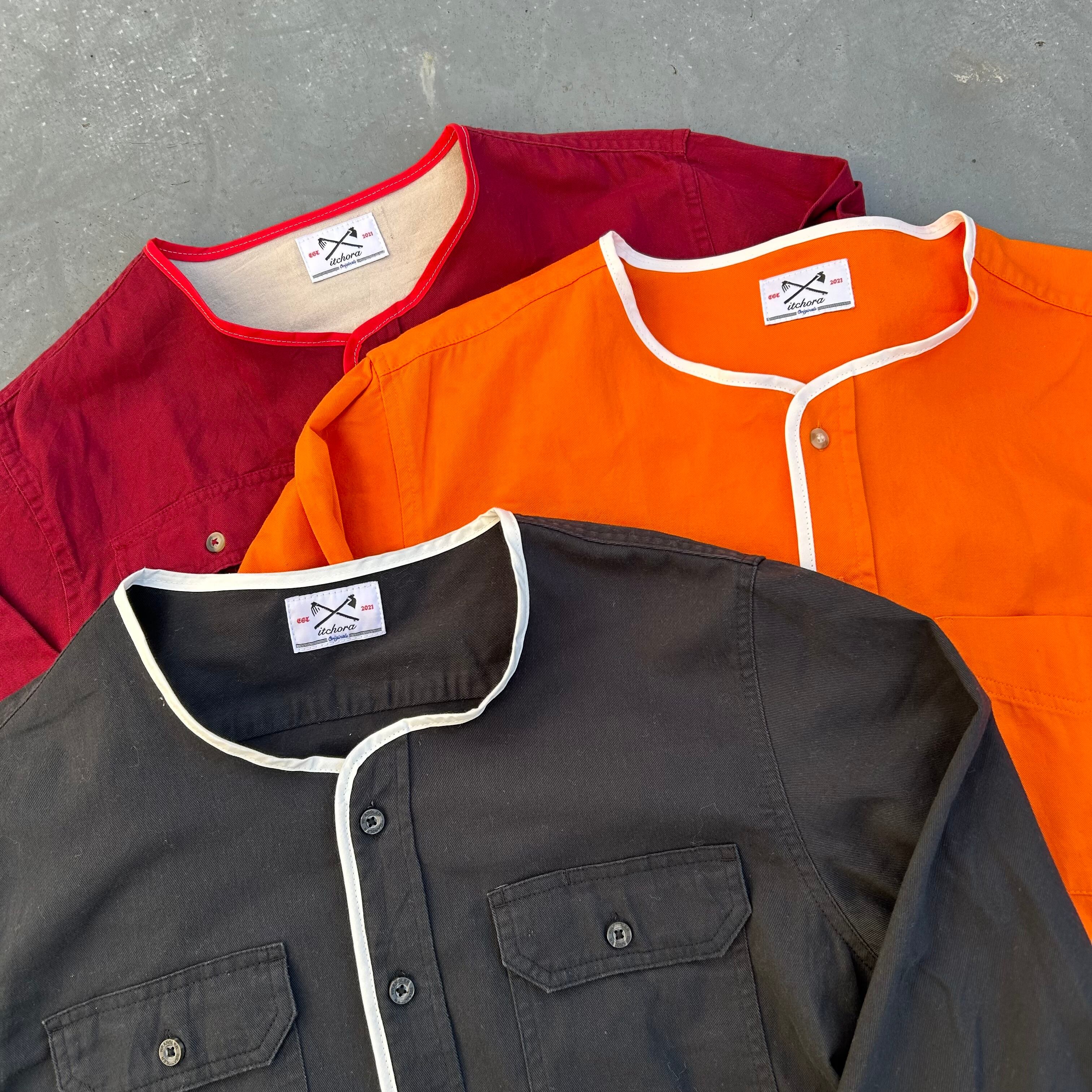 秋冬にも一度リリースした1980年台のワークシャツをベースにノーカラーやパイピングを施し、1から再構築したベースボール風シャツです。