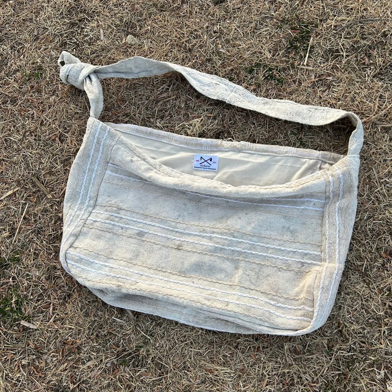"着るBag"をコンセプトにインドの織生地を2ヶ月かけ100%植物由来の素材を使用し、染め上げてから2枚の生地をパッチワーク状に仕立て上げ手作業にて製作しました。